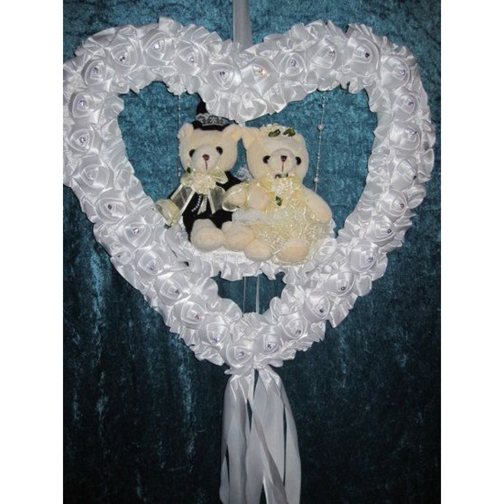 een berenbruidspaar hangend in een hart van bloemen