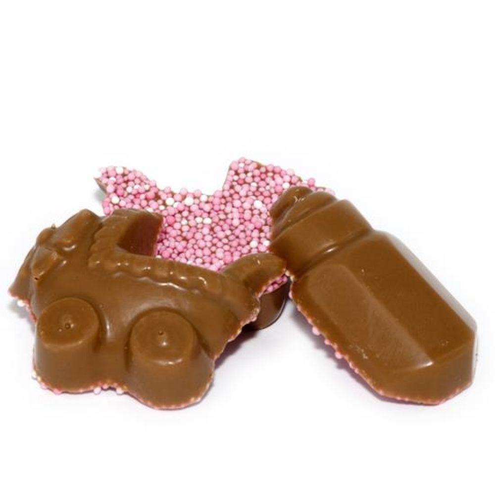100 gram blauwe of roze papflesje en kinderwagen van chocolade
