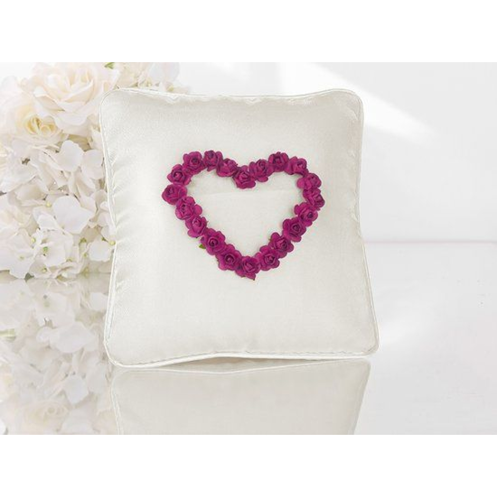 ringkussen van roomwit satijn met fuchcia bloemenhart