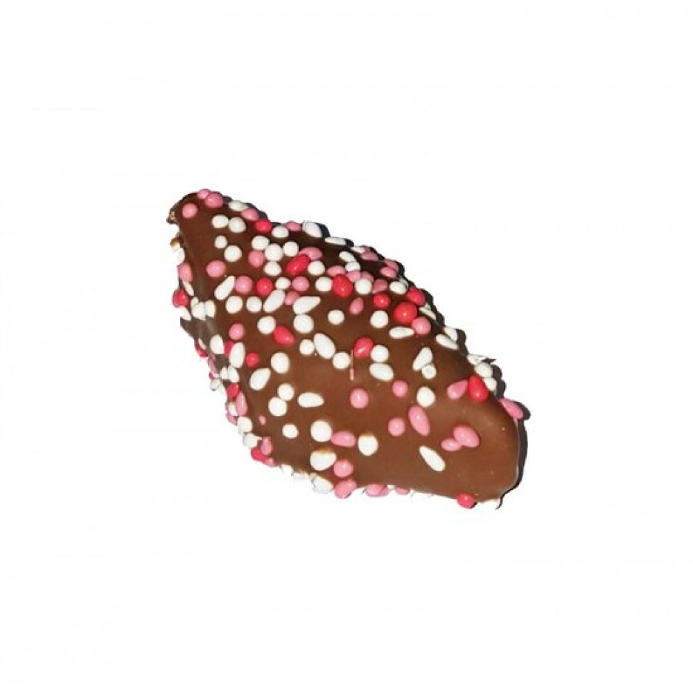 spekken in een chocolade jasje bedekt met blauwe of roze muisjes