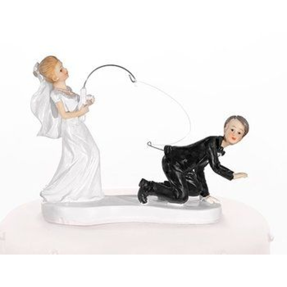 bruidspaar waarvan bruid de bruidegom aan de haak slaat